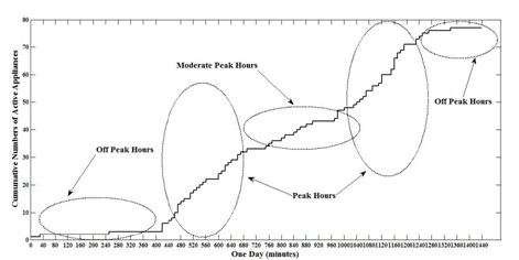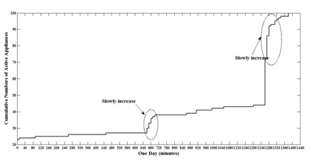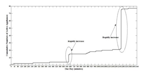Figure 6 illustrates the cumulative numbers of active appliances in the nature condition (i.e. there is no REM scheme and CRA mechanism). In this figure, the number of active appliances rapidly increases in two time intervals, which is respectively from 421 minutes (7:00 am) to 660 minutes (11:00 am) and from 1021 minutes (17:01) to 1260 minutes (21:00). It is approximately same with the peak hours’ period. It also shows the distribution of demands almost concentrates in the peak or moderate peak hours the nature condition.