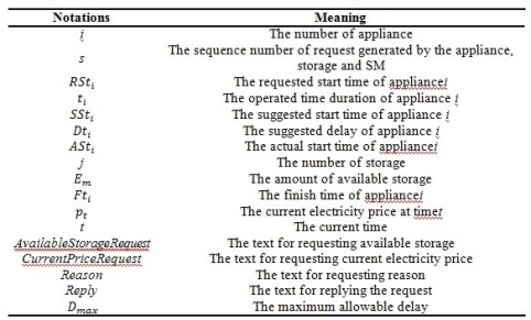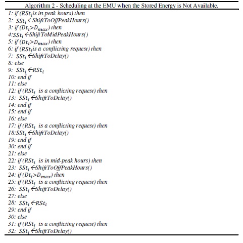 Then, the detailed Algorithm 2 (Scheduling at the EMU when the stored energy is not available) is illustrated in Table 5 as follows. In brief, if the requested start time of appliance isin peak hours, it will be encouraged to shift the start time to off-peak hours or mid-peak hours. Or if the requested start time of demand is in mid-peak hours, it will be encouraged to shift to off-peak hours. During these processes, the maximum allowable delay and conflicting request are considered. Moreover, our previous contribution [10] has some details, which will not list in this paper.