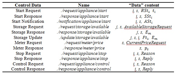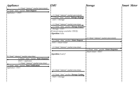 For REM in ICN-HOMENET environment, the control data are illustrated in Table 3. Start Request/Start Response are used for an appliance to inform EMU that it plans to work and then get a suggested start time from EMU. Start Notification is used for appliance to inform EMU its actual start time, which is absolutely decided by consumer. The detailed reason is explained in section 3.2. Storage Request / Storage Response / Storage Update are used for EMU to send request of the amount of available storage to local power generation, get the response of the amount, and inform how much local power left after it is used by any appliance.