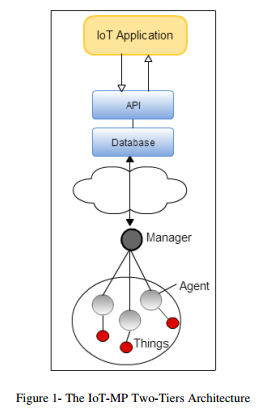 The architecture of the IoT-MP ranges from a simple two-tier architecture consisting of a manager and its associated agents to a distributed architecture which consists of agents, managers and a Manger of Mangers (MoMs). In the simple two-tier architecture, as shown in Figure 1, the IoT-MP adapts the structure used by traditional network management approaches. Here, the IoTMP architecture consists of an agent that resides on a thing and a manager that manages things. The agent acts as a communication agent. It has the responsibility of transporting the data generated or collected by things to the manager. The term Managed Things (MT) is used throughout this work to refer to an agent and the device as one entity. The manager manages many MTs in a system. It is a one-to-many relationship between the manager and its associated MTs. The manager stores the received data, sent by managed things, in a database. The IoT-MP provides IoT and management applications, running on top of the manager, access to the data generated by things and stored in the database remotely over the Internet. The IoT-MP also provides IoT applications with a mechanism to send instructions to MTs e.g. sending actuation instructions to an MT.
