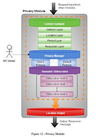 The Privacy Module (PM) combines three main components: the content analysis, privacy manager and semantic obfuscation components. These components were previously introduced in [25]. In brief, the PM provides the administrator of an MT with an added layer of location privacy protection. It enables the user to define privacy-disclosure policies. These policies are used by the manager to determine whether “to disclose” or “not disclose” the location of an MT when an IoT application request access to it. Additionally, it allows the user to control the granularity of the location information of an MT by attaching an obfuscation level to a policy. The architecture of the PM module is provided in Figure 12.