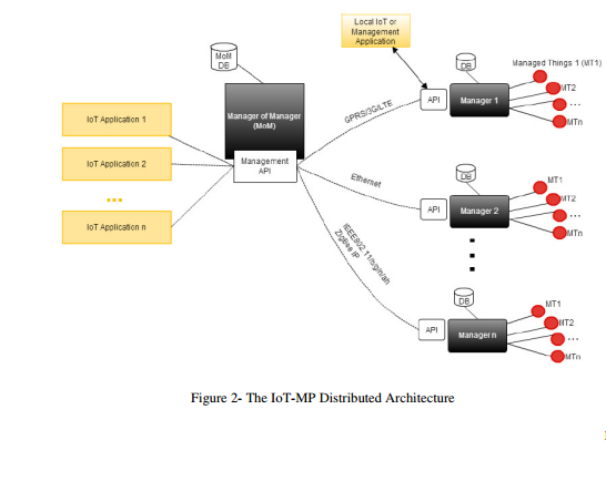 Consequently, the architecture of the IoT-MP provides a centralized model of several agents and a manager allowing for central management of things over local area network. On the other hand, the distributed architecture of several managers and a MoMs creates a distributed system where things communicate in a cooperative fashion rather than stand-alone manner. This flexibility in design caters for the specific communications requirements in the IoT. Given that most IoT devices may play different roles in both centralized and distributed operations setups.