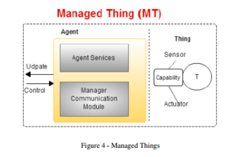 On the other hand, as mentioned before, Managed Thing (MT) is a term used to refer to an entity which comprises of a thing and its agent. Figure 4 illustrates the architecture of an MT. It further shows that an agent has two main modules. The communication module is responsible for the communications with the manager. The second is the agent services module that is responsible for the execution of services such as generating alerts or processing an actuation instruction. Thus, the agent handles the communications between the manager and things by forwarding the collected data to the manager and by processing the requests sent by the manager. In summary, the agent has the followings responsibilities: