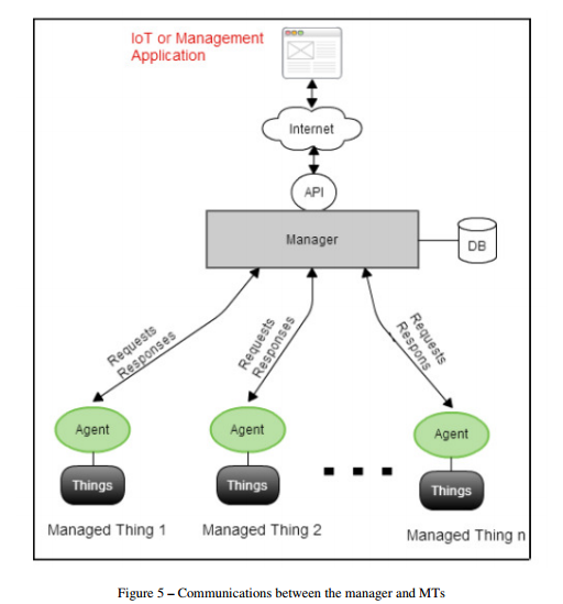 A manager is an application that performs the operational roles of generating requests to retrieve information from managed things. A manager can also send actuation requests on particular MTs, which have actuation capabilities. A manager receives event-based notification reports on MTs generated by their agents as well. Additionally, a manager issues requests for management operations on behalf of an administrator or IoT application and receives notifications from agents. A manager maintains a management database which stores information about MTs. The manager accesses MTs’ data stored in this database. The manager supports a management API based on the Restful architecture. This API allows IoT applications to request over the Internet information