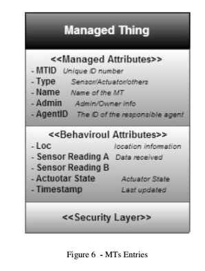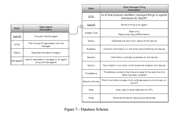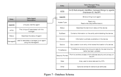 Figure 6 shows examples of Managed and Behavioural attributes. For instance, the MTID is used to uniquely identify an MT. The Type, Name, Admin, and AgentID are other examples of managed attributes. The Loc, Sensor Reading A, and B are examples of behavioural attributes entries in the database. The security layer is a pointer to another process that provides security and location privacy protections. The main parts of the database schema are provided in Figure 7. The table Managed Things, from Figure 7, contains the followings entries: