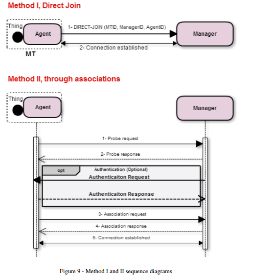 In the direct joining method I, the thing is pre-programed with the IP address of the manager. This allows the thing to send a DIRECT-JOIN request, via an agent, to the manager. In method II, the process of connecting an MT to the manager through association is similar to that of a Wi-Fi device which associates with an access point. Method III is used when an MT loses its connection with the manager and tries to re-connect. This can happen when an MT moves out of range of the local-area network or when the manager becomes unavailable. In such a case, the MT will try to reconnect and join the network using Method I or II. The difference between method I and II on one hand and that of III, on the other hand, is that in method III there is no need to create a new record in the database for the MT. Instead, the manager updates the existing database record.