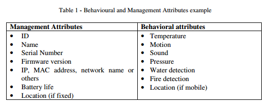 optional as they are inheritably associated with the features and the applications of things. For instance, a temperature sensor that has the responsibility for collecting motion and temperature data from a given environment will choose the “Temperature” and “Motion” from the behavioural attributes lists. Other things with a different functionality or scope such as a fire detection sensor will choose the “Fire Detection” from the list of the behavioural attributes. Operators of things may also create new attributes in the management database to represent them.