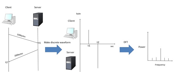 Preparation: Make the standard discrete waveform from the average of payload and time elapsed of ordinary session. Apply window functions to the standard discrete waveforms. Derive the standard spectrum by performing DFT to resultant discrete waveform.