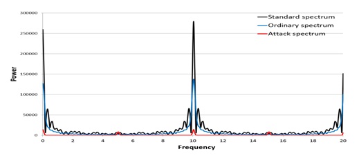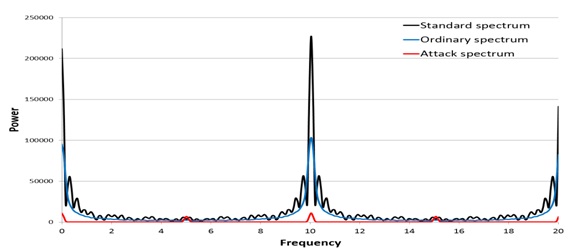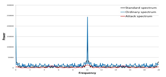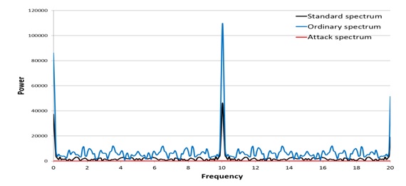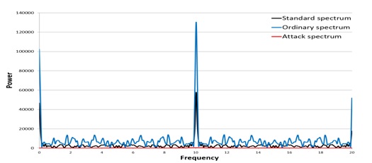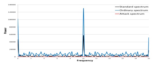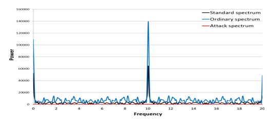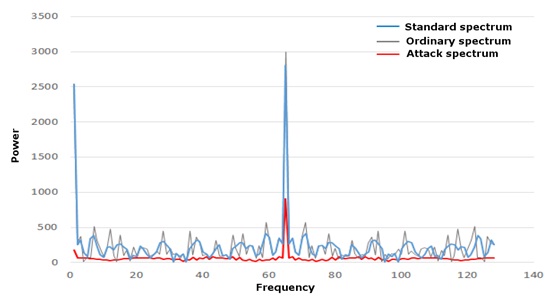 In Step-3, we compare the spectrum derived in Step-2 withthe standard spectrum. Figure2 shows an example of detection.We use visual identification in Figure.2, and focus on statusof spectrums between 0 [Hz] and 65 [Hz].The behavior of standard spectrumand ordinary ones become random in the frequency range.However, attack spectrums have almost constant comparingwith the standard spectrum. As a result, we can distinguish ordinaryspectrums from attack ones.