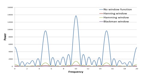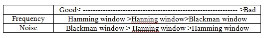 The characteristics of each window functions are summarized in Table 1. “Frequency resolution” denotes the characteristicof window function depended on frequency width. Whena window function has good frequency resolution, we can distinguish each spectrum clearly. As a result, we can evaluatemore detailed spectrums.In general, frequencyresolution and noise suppression have trade-off relation as shown in Table1.