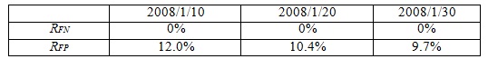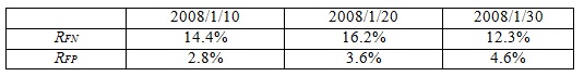 As an index to evaluate performance of IDS, we use falseoccurrence rate. There are two types of false; false negativeand false positive. False negative is wrong detection that attacksession is decided as ordinary one. On the other hand, falsepositive is wrong detection that ordinary session is decided asattack one. In this paper, we calculate the rate of false negativeRFNand one of false positive RFPas follows[11].