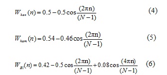 whereW*(n) denotes window functions and symbol“*” denotes element of {han,ham,Bl}.In order to choose a window function suitable for our proposalmethod, we execute detection experiments by applying each window functions (see section 4.5).