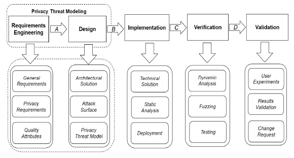 Figure 1 represents different phases in a common SDLC. Initial security requirements are collected and managed in the requirements engineering phase (A). This includes identifying the quality attributes of the project and assessing the risk associated with achieving them. A design is composed of architectural solution, attack surface analysis and the privacy threat model. Potential privacy threats against the software that is being developed are identified and solutions are proposed to mitigate for adversarial attacks (B). The proposed solution from the design phase is implemented through a technical solution and deployment (C). This includes performing static analysis on source code for software comprehension without actually executing programs. The verification process (D) includes extensive testing, dynamic analysis on the executing programs on virtual resources and fuzzing as a black-box testing approach to discover coding errors and security loopholes in the cloud system. Finally, in the Validation phase the end-users participate to assess the actual results versus their expectations, and may put forth further change requests if needed.