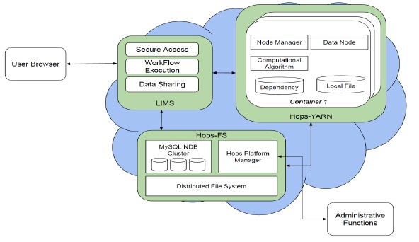 The BiobankCloud LIMS consists of several components for secure access, workflow execution, data sharing, as shown in Figure 4. Hops-FS as the next-generation of the Hadoop Filesystem (HDFS) supports multiple stateless Name Nodes but it keeps the metadata in a MySQL Cluster. Hops-YARN is another component that provides distributed stateless resource management with storing states in the MySQL Cluster for fault-tolerant.