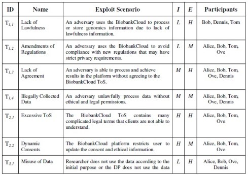 Table 3, Risk evaluation matrix for the identified threats. I indicates the likelihood of threat and E indicates the effect of exploiting the threat on the whole BiobankCloud.