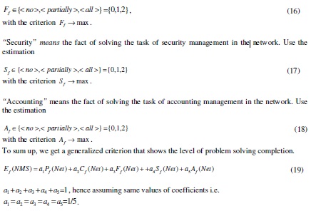 4. Evaluation of the completion level after system integration. This step should cover the following points: the evaluation of the supporting level for performance (14), for configuration management (15), for fault tolerance (16), for security management (17), for user accounting (18), and evaluation of the total value of expected completion level Ef (NMS)(19).