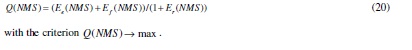 This final generalized criterion is estimated as the ratio of sums of efficiencies (Ef(NMS) + Ee(NMS) ) to the criterion of expected risk Er(NMS) . Since the value of criterion Er(NMS) could be equal to 0, use a biased estimate (1+ Er(NMS)) . The final equation will be