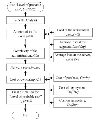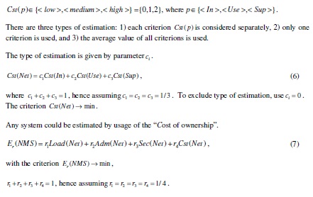 2. Evaluation of the level of probable risk for the integrated system. This step should cover the following points: the evaluation of the additional network load created by service traffic (1), (2),(3), the probable increase of complexity of administering process (4), the probable decrease of security level (5), cost evaluation depends on integrated system such as: cost of purchase ( Cst(In) ), cost of deployment ( Cst(Use) ), cost on supporting (Cst(Sup) ) (6) and general estimation of probable risk Er (NMS) (7).