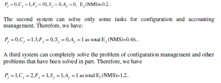 Third system is a complex multifunctional system, perhaps like management platforms MS System Center or IBM Tivoli. This system has an additional impact on the existing network administration process and complicates it’s Load(Net) = 2 , Adm(Net) = 2 . This can change the security level; Sec(Net) = 2 , and has a high cost;Cst(Net) = 2 . Thus, the final estimate of the