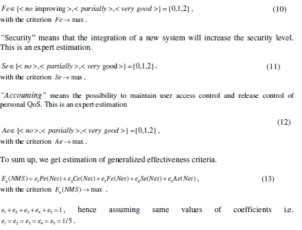 3. Evaluation of the benefits after integrating the system in maintaining the network. This step should cover the following points: the evaluation of the probable improving of performance (8),configuration management (9), network in general (10), security level (11), accounting for users (12) and evaluating the total value of expected efficiency Ee (NMS) (13).