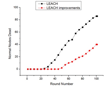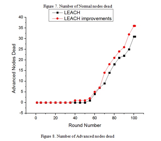 Figure 7 and figure 8 shows the number of advanced nodes and normal node through the round dead, the number of node dead improvements algorithm is more optimal