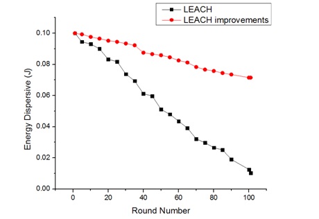 Figure 3 shows the energy dissipated of the algorithm, is clearly improved algorithm uses less energy than LEACH. With the initialization energy is 0.1(J) after 100 rounds, LEACH energy level of remaining 0.01(J) while that the LEACH improvement is 0.07(J). Reduce energy dissipation is mainly based on the selection of a CH selective manner and distance data transmission is minimized.