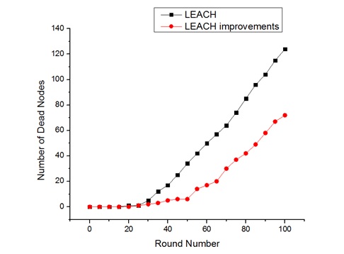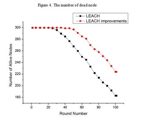 Figure 4 and figure 5 and show the number of nodes dead and the number of nodes alive after each round. Here with 300 nodes initially and after 100 rounds, number of node died of the LEACH improvement is 70 nodes much lower compared LEACH is 120 nodes. Protocol our proposals could extend the life of the network than LEACH. Because our protocol selection CH a more selective manner and besides the data transmission of the nodes is managed by the threshold level has brought better results.
