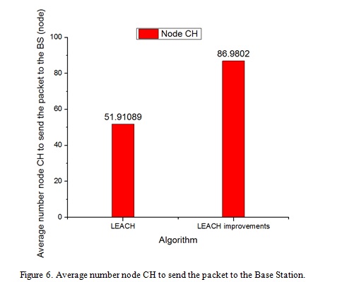 Figure 6 show the average number node CH to send the packet to the BS, here improvements algorithm will be getting larger the number of packets transmitted from CH to the BS, ensure that the data to destination time critical.