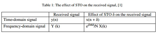 signal in time and frequency domain. Channel effects and noise are neglected for simplicity.The presence of STO in the time domain causes phase offset of 2πkd/N in the frequency domain.This phase offset is proportional to the sub carrier index k as well as the STO δ, Table 1.