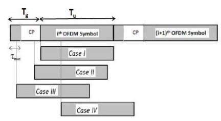 demodulate an OFDM symbol at the receiver using N point DFT, it is very important to take exact samples of transmitted OFDM symbol. The correct starting point of DFT window is needed to preserve the orthogonality among the sub-carriers. OFDM systems present many advantages in comparison with single carrier system however all these advantages can be relevant only when the orthogonality among sub-carriers is kept. If one DFT window takes sample of two different OFDM symbol generating ICI and ISI. Table 1 shows the effect of timing offset in the received