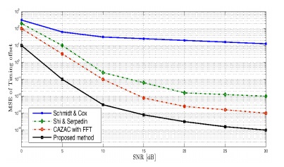 Figure 9: MSE of STO estimation for proposed method compared to known method: Schmidl and Cox, Shi and Serpedin.