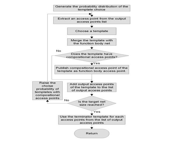 The Final step of the iteration is to check the target net size and update the probability distribution of templates. While the net target size is not obtained, it increases the probability of selecting a compositional template. After all compositional access points of the function body are satisfied these probabilities are zeroed. Dynamic updates of a probability distribution are necessary in order to ensure that when the target net size is reached, all compositional access points are satisfied.