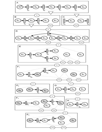 The template “H” is called a terminator. This template has only one access point in the input interface that consist of a pair of places, so after merging with the function body the resulting net the number of unsatisfied access point would decrease.