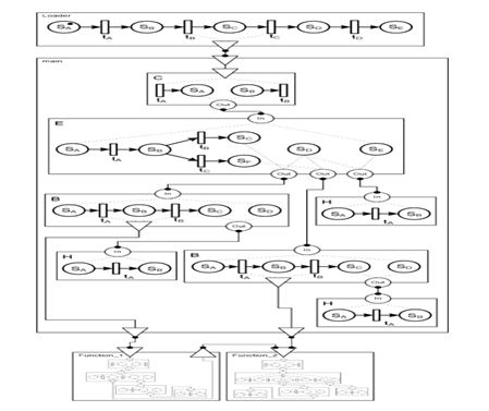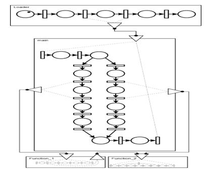 Fig. 5 shows the result of templates merging. This net is similar in behavior to a real program consisting of a branch operator, which has two branches in the function “main”. Functions “Function_1” and “Function_2” are called from the first and second branch respectively. In addition, the function “Function_1” calls the function “Function_2”.