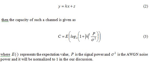 The channel capacity is the ultimate data rate that a channel can support without any error. Let us consider the model of fast fading channel where the transmitted signal is multiplied by a random fading coefficient and an additive white Gaussian noise (AWGN) is added as follows