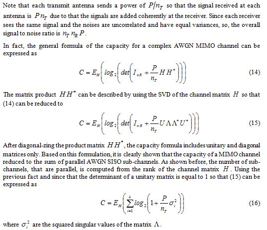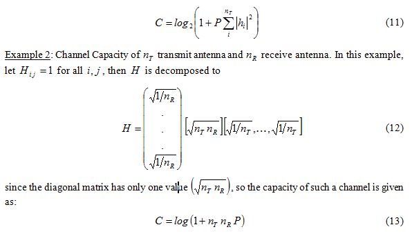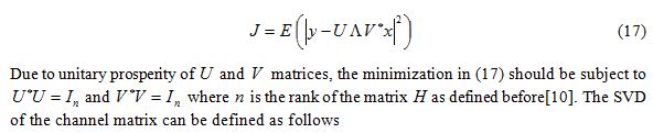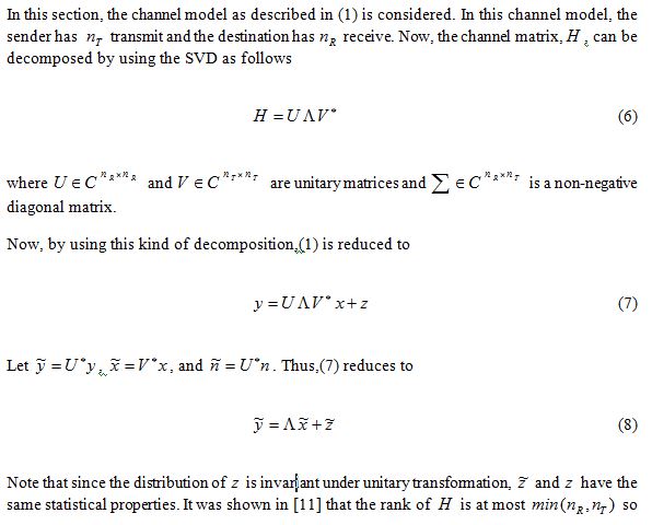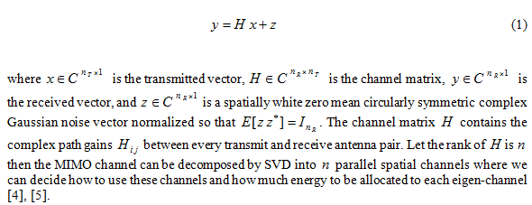 One of the pioneering works in communication system is the use of multiple input multiple output (MIMO) which provides a very large spectral efficiency [1], [2]. MIMO transmission based on singular value decomposition (SVD) is an effective mathematical technique to obtain the MIMO channel capacity [1], [3]. Consider a MIMO channel with transmit antenna and receive antenna, modeled as