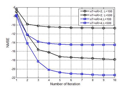 Figure 2. The NMSE of estimating the channel matrix Vs. the number of iterations .