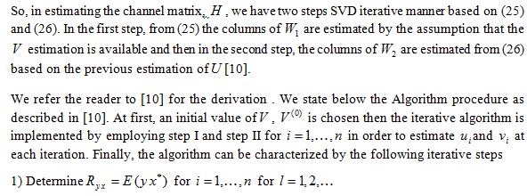 The receiver is designed so that it can estimate the channel state information(CSI). The performance of the MIMO communication system depends highly on the accuracy of the CSI. Any error even if it is small in the estimation of the CSI deteriorates the channel performance. In this section, an iterative MIMO channel SVD estimation technique is introduced.