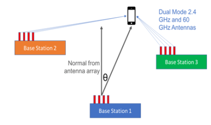 Figure 1: Localization scenario for mmWave networking. In this illustration, we use 60 GHz mmWave for high-speed data transmission and 2.4 GHz frequency band for localization. We also illustrate the manner in which angle-of-arrival is measured, denoted by θ.