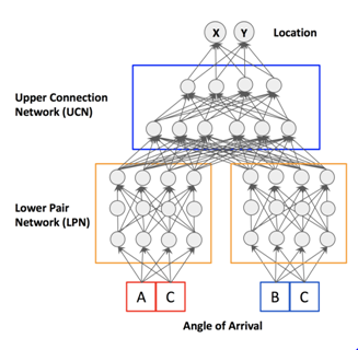 We now discuss the training process for the Lower Pair Network (LPN), and afterwards describe the training process for the Upper Connection Network (UCN). The training samples for each neural network in the LPN are angles-of-arrivals (AOAs), as measured by the corresponding pairs of base stations. The output used in training the model is the location of the mobile node in the real space. We use a rectified linear unit (ReLU) as the activation function, and an l2-norm loss function. Each neural network within the LPN is trained independently of one another, as there are no connections between each unit of the LPN, only in the UCN.
