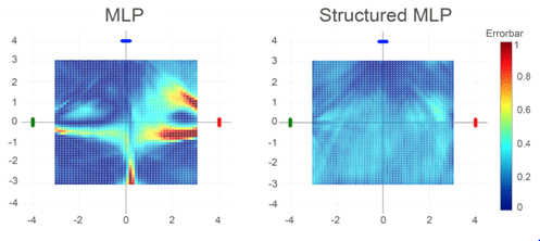 Figure 4: When simulating data without noise, the non-structured MLP (left) is unable to resolve the collinear regions while our proposed Structured MLP (right) model can.