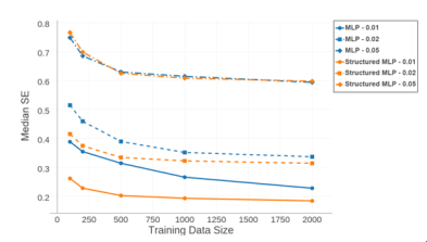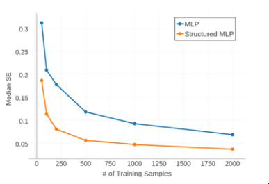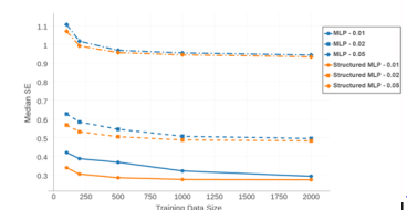 Figure 5: Using simulation data without noise, we show the improvement in localization accuracy, in Median SE, of the Structured MLP (SMLP) as compared to the non-structured MLP model. Further, we find that for a given accuracy, the SMLP can localize nodes using only a fraction of training data required by the non-structured MLP for comparable performance.