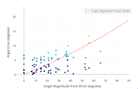 Figure 7: Our Angle Dependent noise modela(θ)with k=1 and j=4 (red dotted line) reflects real-world data captured from field experiments (points) over various angles (x-axis), as shown by the fact that the noise model mirrors the real-world points as the angle varies