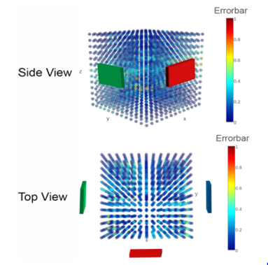 We find that the 3D results follow the same trends presented in the previous results section. This is due to the fact that the primary difference between MLP and SMLP models is their ability to address the collinear region, which remains roughly the same in size in both the 2D and 3D cases, as the region lies within the 2D plane with minimal impact in the added third dimension. Figure 9 is a 3D rendering of the predicted positions and associated Median SE from two different viewpoints: a top-corner view and a ceiling view. As previously seen for the 2D results, the error concentrates itself along the collinear region along the straight line between base stations. We have omitted complete results for the 3D simulations due to space concerns, as they very closely mirror that of the 2D results.