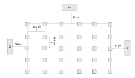 Figure 10: Layout of indoor and outdoor experimental setups: a five by six grid for the transmitting USRP location (for the mobile node) with three base station (BS) locations around the grid