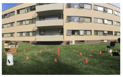In order to evaluate our models on real-world datasets, we use the setup shown in Figure 10. We use a five by six grid of location points, resulting in 30 locations in total. We use three base station locations. However, due to equipment limitations (having only one base station node consisting of four USRPs as an antenna array of four antennas), we move the base station to the three locations sequentially and re-measure at each location, but logically this is equivalent to having three base stations measuring at once. Note that we use a two-dimensional setup, as we lack an antenna array with vertical polarity. However, based on the similarity between our 2D and 3D simulation results, we expect that 3D results in the field would be very similar to the results presented here. The environment is an outside, open, grassy area, as shown in Figure 11.