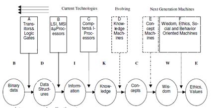 The platform for the next-generation computers to process information, knowledge, concepts, or wisdom starts at platforms (i = 2, 3, 4, and 5) respectively in Figure 1. The content (full lines) comes from all the databases of prior domains and from all sources including Internet, WWW, knowledge bases, broadband and digital networks, and library databases. It is important that the content satisfy the processing capability of content at that particular node[39][43].
