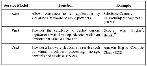Cloud computing delivers computing software, platforms and infrastructures as services based on pay-as-you go models. Cloud service models can be deployed for on-demand storage and computing power in various ways: Software-as-a-Service (SaaS), Platform-as-a-Service (PaaS) and Infrastructure-as-a-Service (IaaS). Cloud computing service models have been evolved during the past few years within a variety of domains using the “as-a-Service” concept of cloud computing such as Business Integration-as-a-Service, Cloud-Based Analytics-as-a-Service (CLAaaS), Data-as-a-Service (DaaS) [61, 62]. This paper refers to the NIST cloud service models features [6] that are summarized in Table 2 that can be delivered to consumers using different models such as a private cloud, community cloud, public cloud, or hybrid cloud.