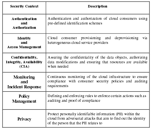 This section reviews the research on security solution such as authentication, authorization, and identity management that were identified in Table 3 [10] as being necessary so that the activities of cloud providers are sufficiently secure.