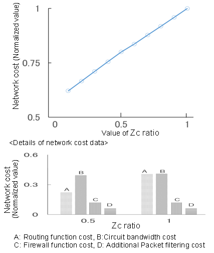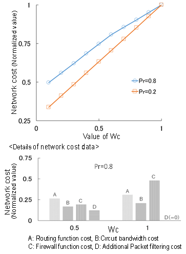 <Reason> As Wc becomes smaller; the costs of the firewall function and the additional packet filtering function become smaller, as shown in Figure 9. Meanwhile, the routing function cost and the bandwidth cost remain unchanged. Thus, the total network cost is reduced. Moreover, in the example shown in Figure 10, halving the value of f does not change the firewall function cost, the routing function cost or the bandwidth cost, but reduces the cost of the additional packet filtering function. Thus, the network cost can be reduced.